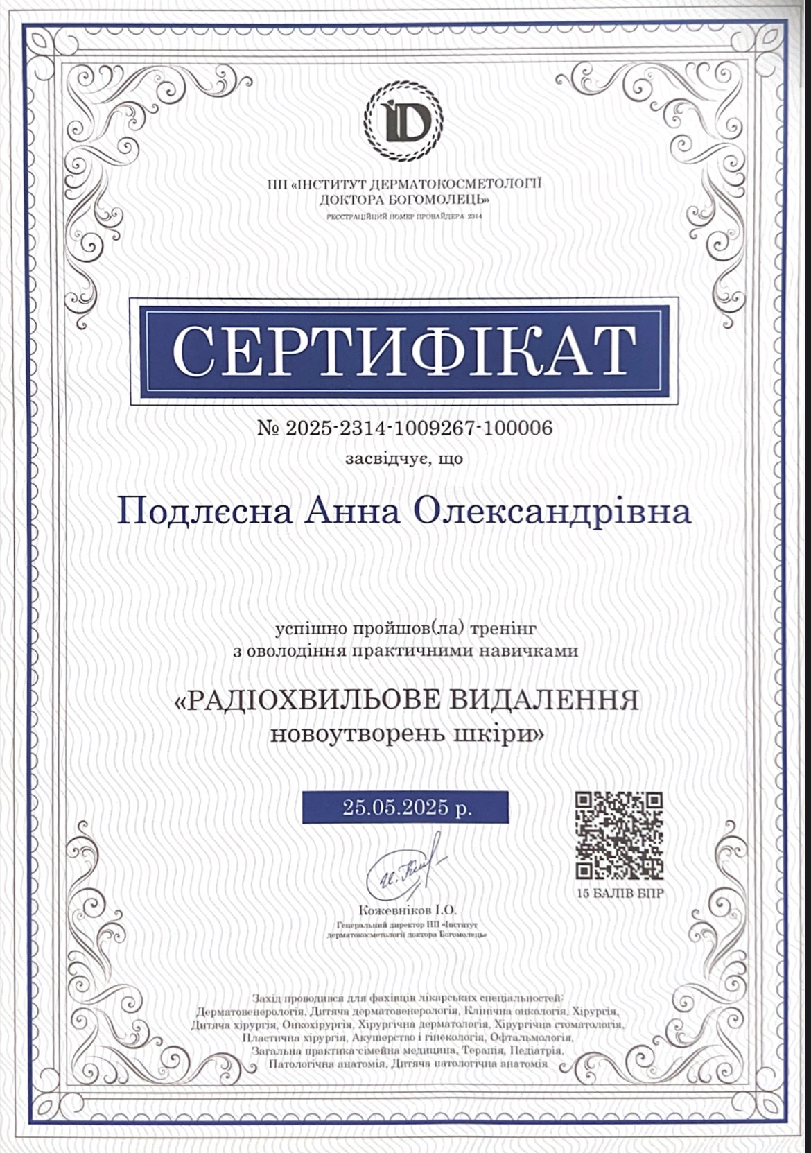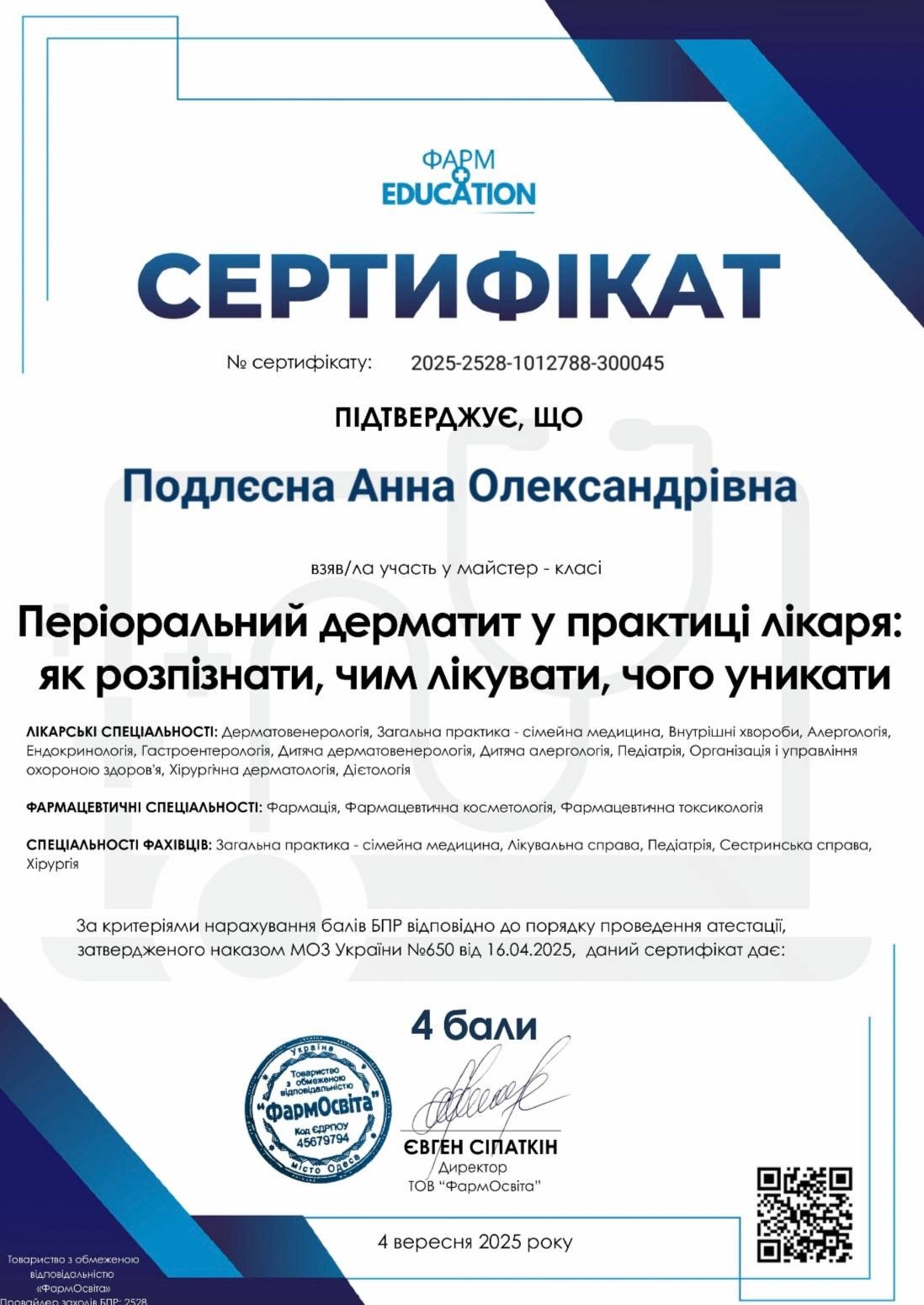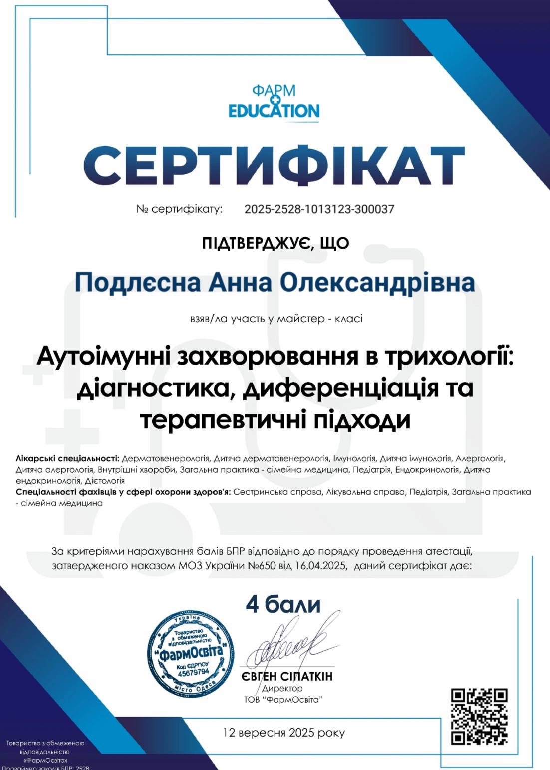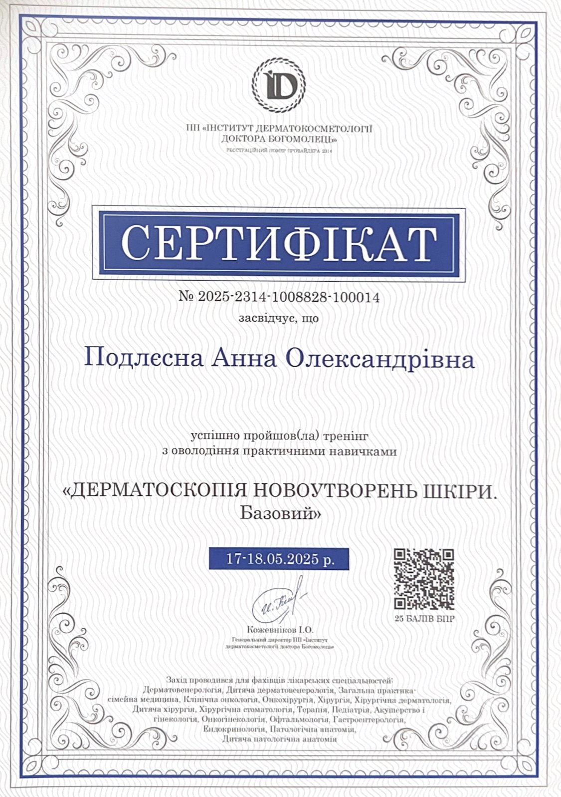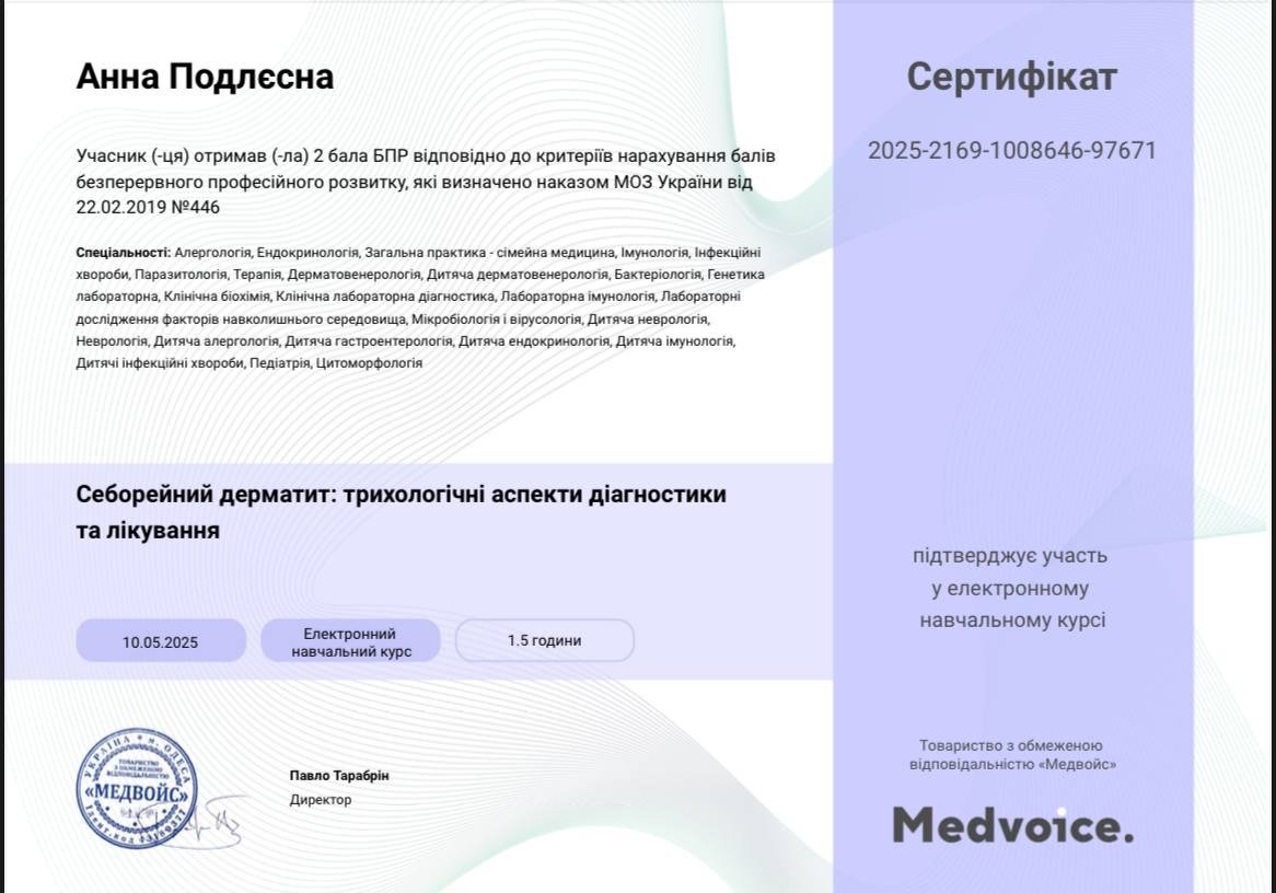 - Спеціалізація з дерматовенерології (ВНМУ ім. М. І. Пирогова)