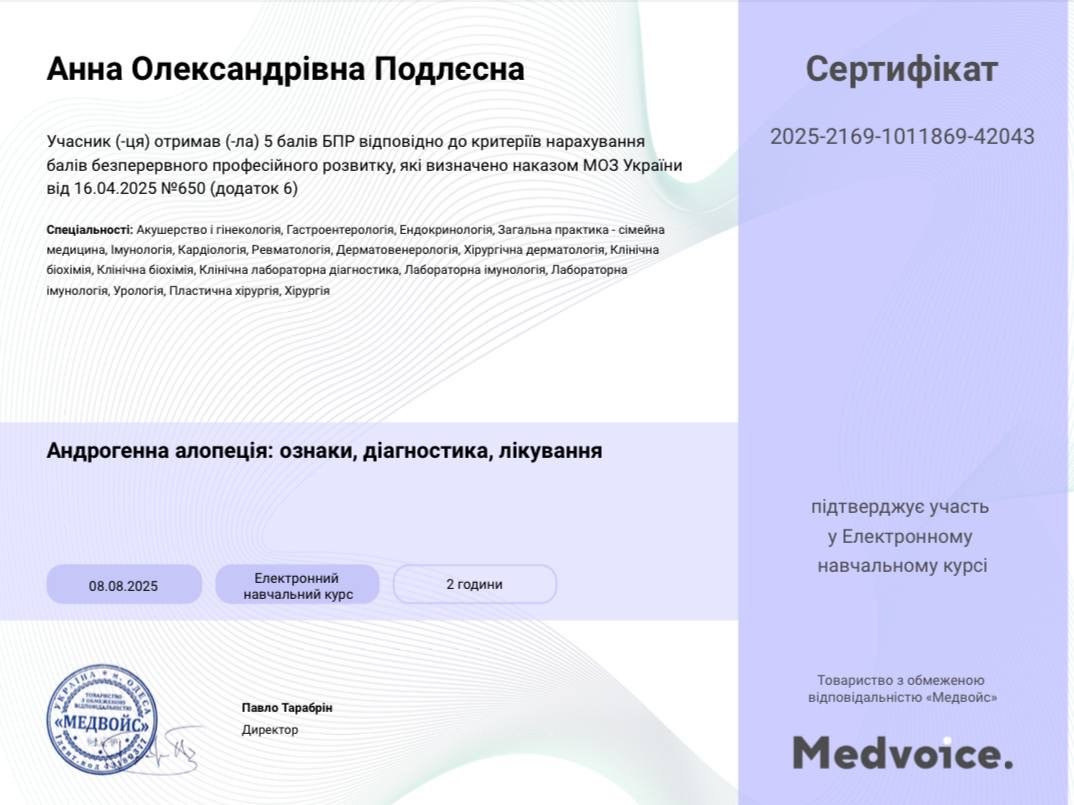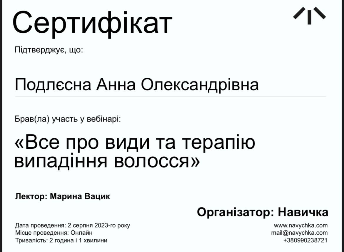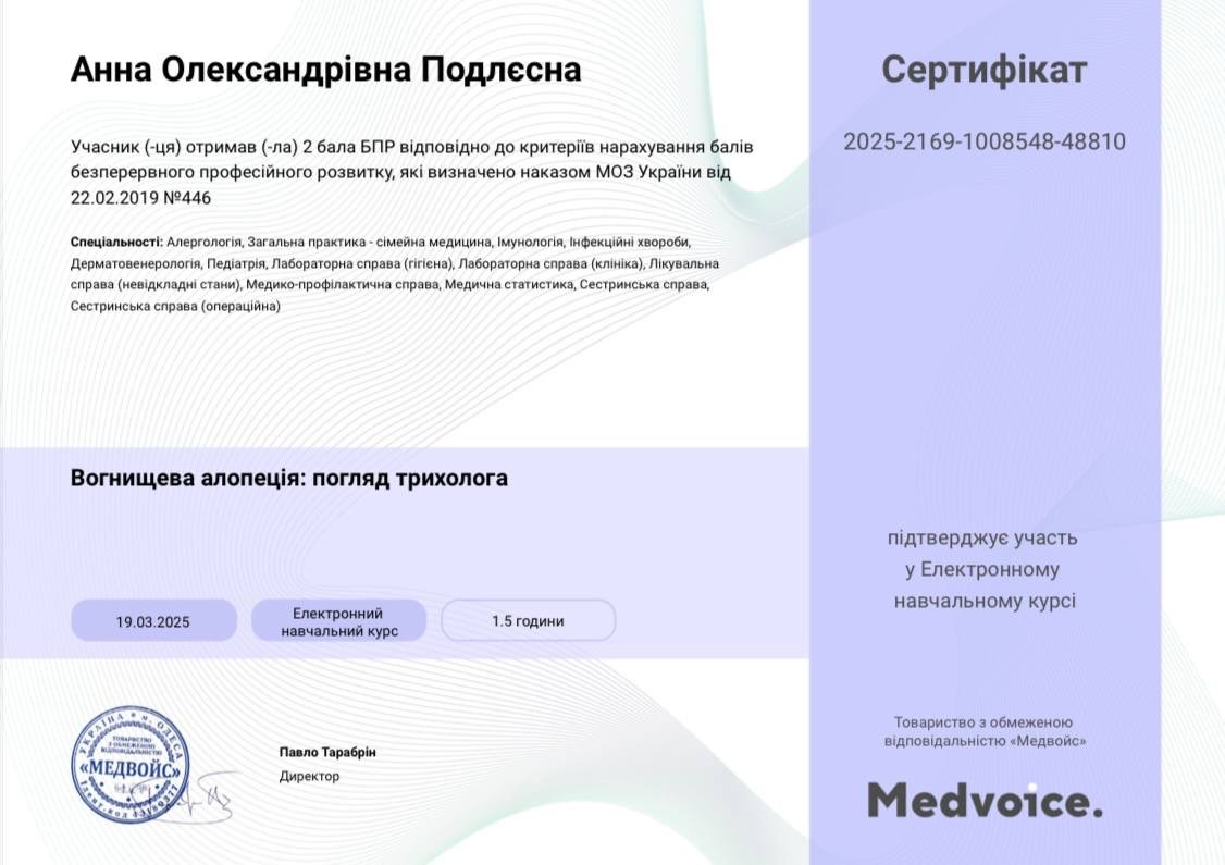 Працюю з випадінням волосся, усіма видами алопецій та станами шкіри голови у дорослих і дітей. На консультації уважно розбираю вашу історію, шукаю причину змін і пояснюю все простою мовою. Моя задача — скласти зрозумілий, реалістичний план лікування й догляду, який підходить саме вам і який реально виконувати щодня.